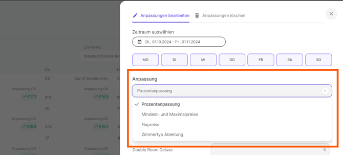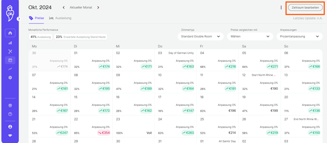 Mit der Funktion Zeitraum bearbeiten können Sie Preisempfehlungen für einzelne Tage oder mehrere Tage gleichzeitig anpassen und behalten dabei die volle Übersicht über alle Ihre Änderungen.