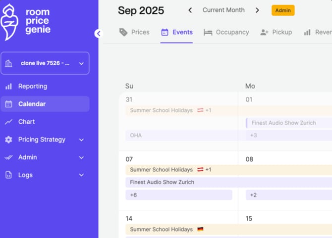Kein Klicken durch verschiedene Daten mehr, um herauszufinden, was gerade passiert — jetzt sehen Sie alles auf einen Blick und können intelligenter planen. RoomPriceGenie bietet eine zentrale Übersicht über alle regional relevanten Events, die auf einen Blick zugänglich sind – im „Events Calendar“.