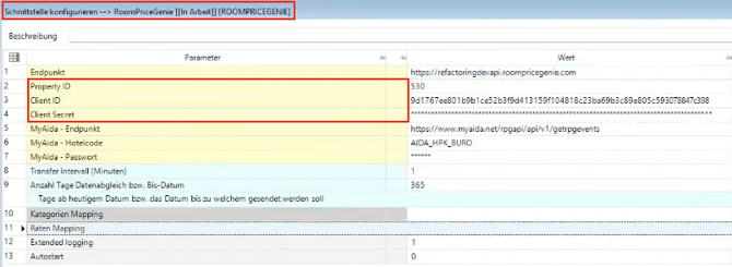 In der Parametertabelle tragen Sie die folgenden Felder genauso ein, wie sie vom RoomPriceGenie-Team bereitgestellt wurden: