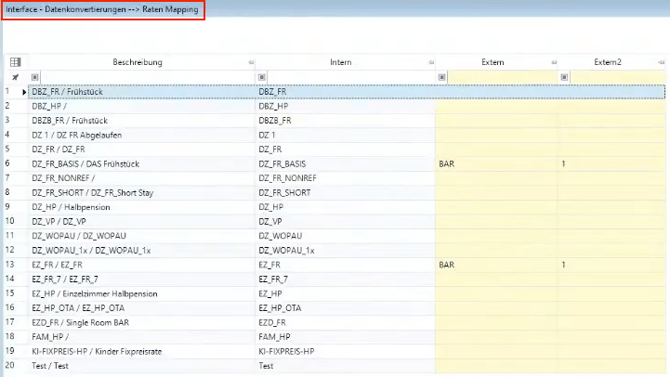 Hier ordnen Sie jeden internen Raten-Code dem entsprechenden externen Raten-Code von RoomPriceGenie zu.