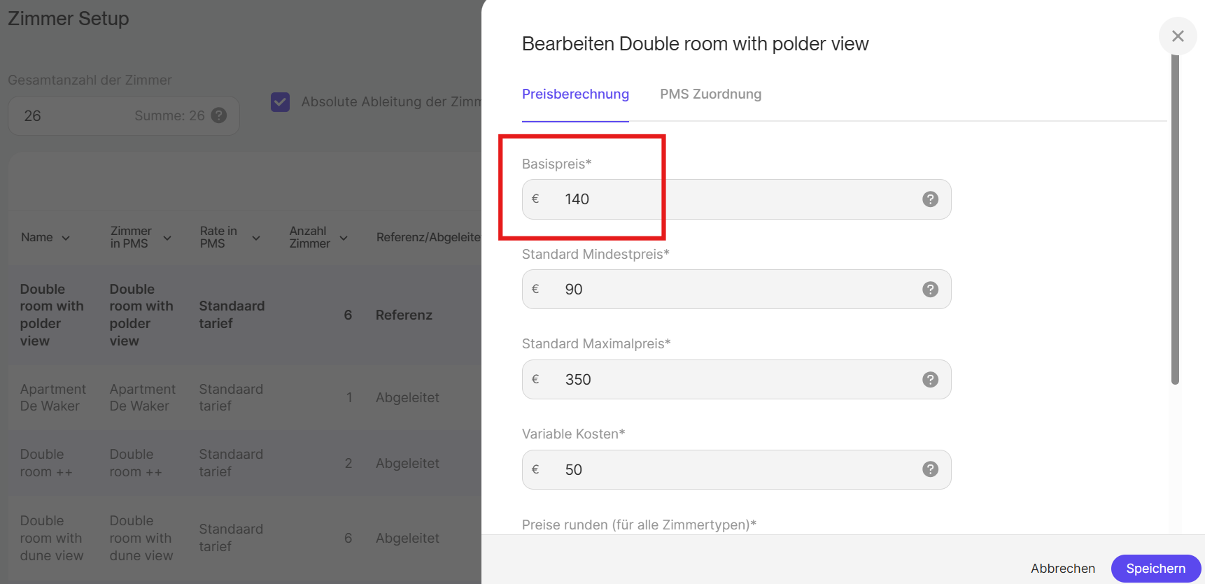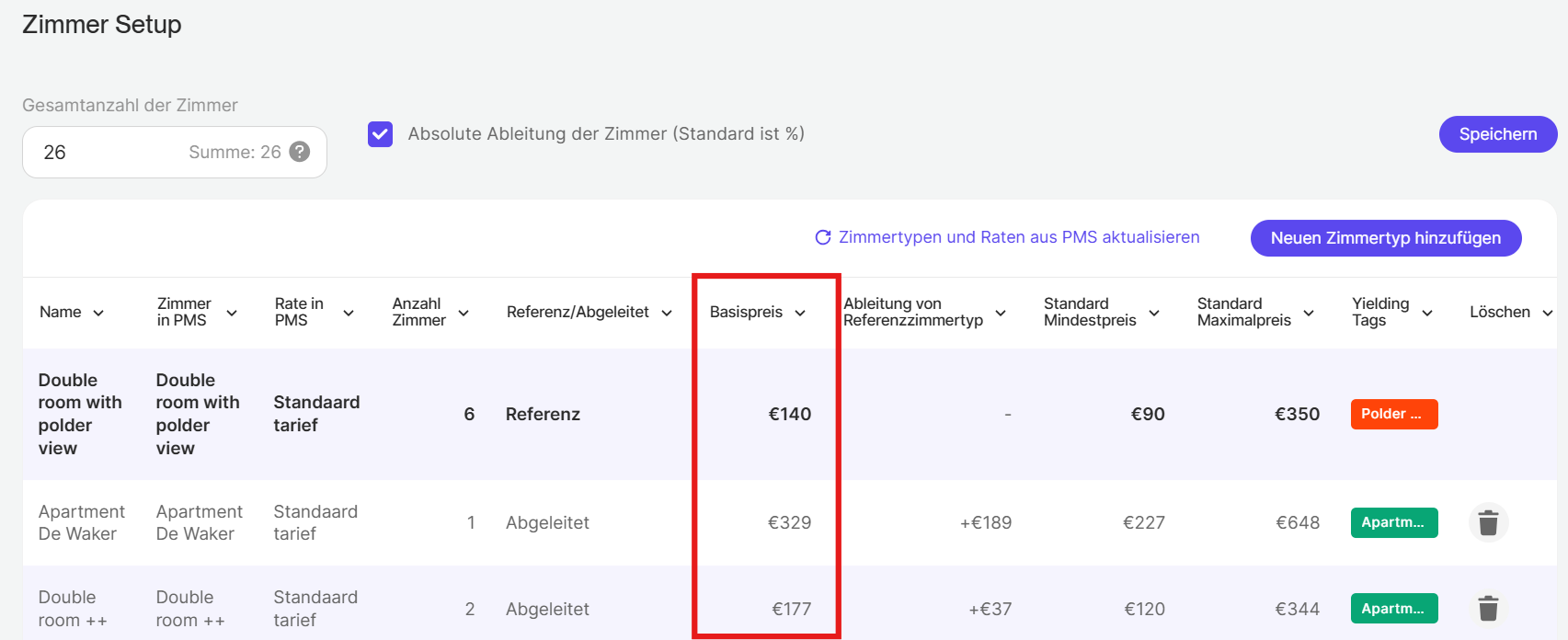 In der Raumeinstellung können Sie den Basispreis für alle Ihre Raumtypen auf einem Bildschirm anzeigen und bearbeiten.