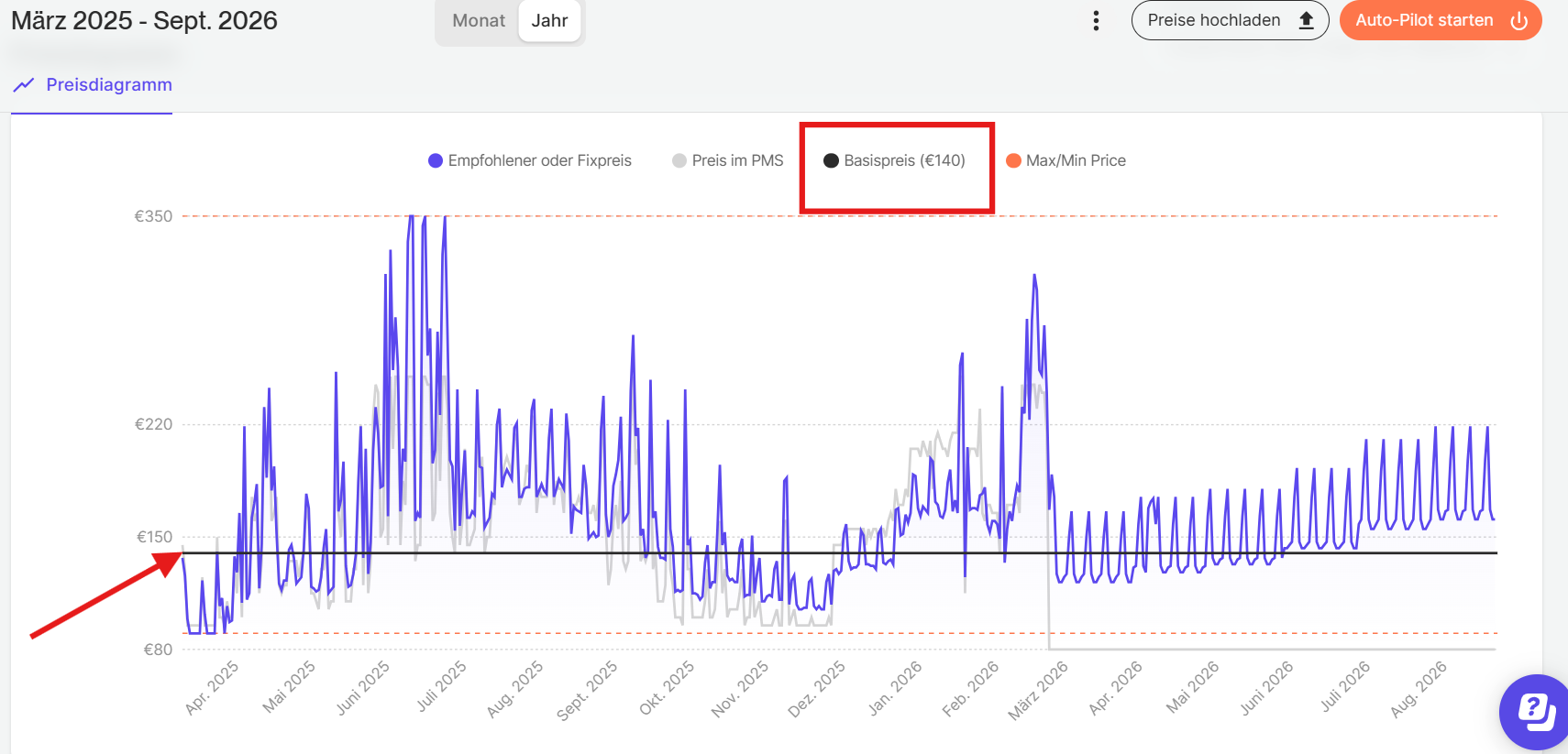 Die Diagrammansicht bietet einen klaren Überblick über die Preise der nächsten 365 Tage. Der Basispreis wird durch eine schwarze Linie im Preisdiagramm angezeigt.
