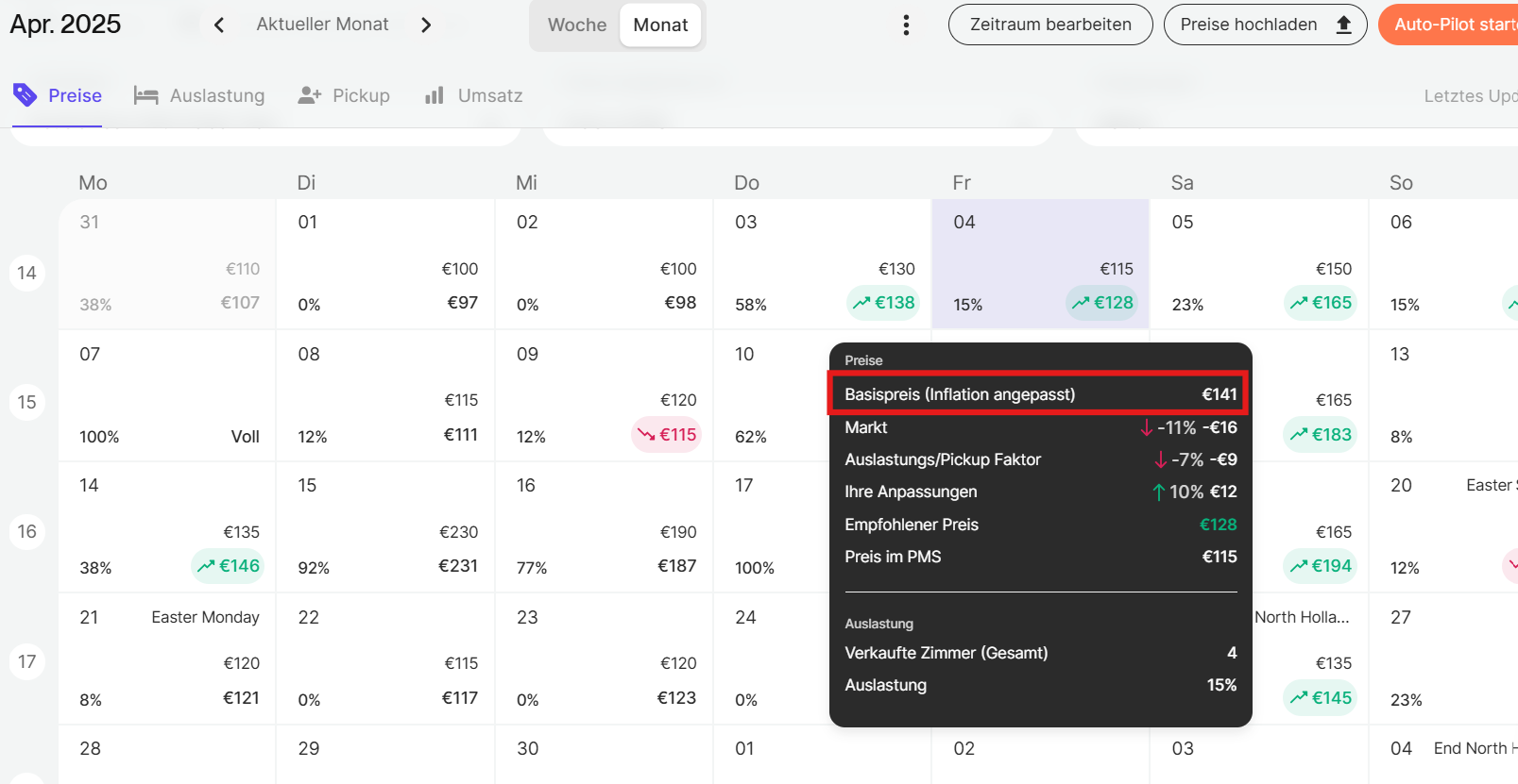 Wenn Sie in der Kalenderansicht mit der Maus über die einzelnen Tage fahren, werden Informationen über die Preisgestaltung angezeigt. Der Grundpreis steht wieder ganz oben in der Liste.