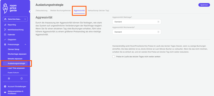 Im Allgemeinen empfehlen wir, diese Einstellung auf Standard zu belassen. Für einige sehr kleine Hotels empfehlen wir Niedrig oder Sehr Niedrig. Mehr darüber erfahren Sie hier: Aggressivität.