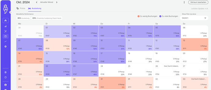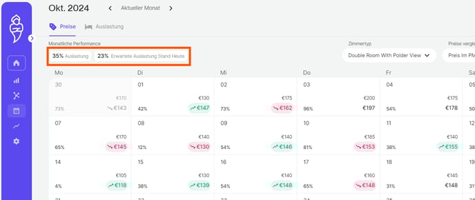 Die tatsächliche gegenüber der erwarteten Belegung wird im Auslastungskalender angezeigt. Der Auslastungskalender ist farblich gekennzeichnet und zeigt Ihnen an, ob Sie über oder unter dem erwarteten Wert liegen. Eine lila Schattierung bedeutet, dass Sie über dem erwarteten Zielbelegung liegen, eine orange Schattierung, dass Sie unter Ihren Erwartungen liegen (linke Ecke der Zelle).