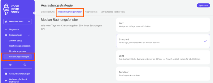 Das "Mittlere Buchungsfenster" finden Sie unter "Preisstrategie" und "Auslastungsstrategie".