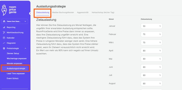 Die "Zielauslastung" finden Sie unter "Preisstrategie" und "Auslastungsstrategie"