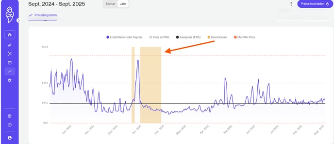 Wenn das gesamte Haus geschlossen ist (Saisonpause, komplette Renovierung), schließe einfach 100 % der Einheiten für die betreffenden Daten; die Kalender- und Diagrammansicht zeigt die Schließung an.