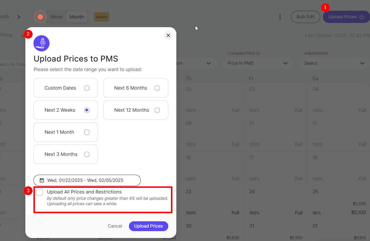 Falls du die neuen Preise jedoch sofort hochladen möchtest, kannst du oben rechts im Kalender auf „Preise hochladen“ klicken (siehe unten).