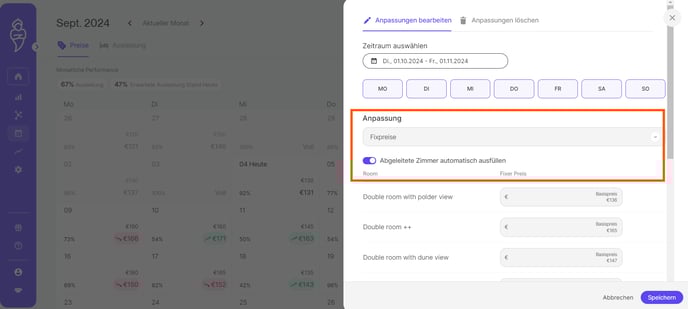 Wenn Sie die restlichen Räume in RoomPriceGenie abgeleitet haben, haben Sie die Möglichkeit, den Regler 'Abgeleitete Zimmer automatisch ausfüllen' zu aktivieren. Dies erlaubt RoomPriceGenie, automatisch Fixpreise auf alle Zimmertypen anzuwenden, die auf der Ableitungsregel basieren. Wenn Sie es vorziehen, die Fixpreise für verschiedene Kategorien individuell festzulegen, können Sie diese Option auch einfach deaktivieren.