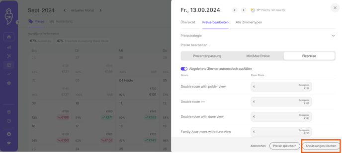 Das Löschen der "Fixpreise"-Anpassungen in RoomPriceGenie ist ein einfacher Prozess. Wenn Sie für ein bestimmtes Datum oder einen bestimmten Zeitraum keinen Festpreis mehr haben möchten, können Sie diesen einfach aus dem System entfernen. Dadurch kann RoomPriceGenie wieder Preisempfehlungen basierend auf seinen Algorithmen und Ihren Preisregeln berechnen.
