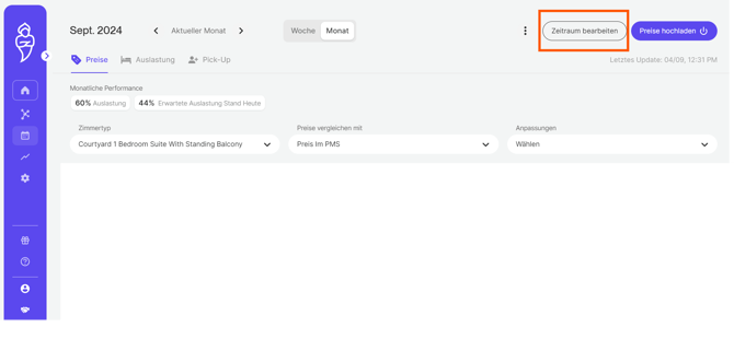 Mit der Zeitraum bearbeiten-Funktion, können Sie bestimmte Wochentage für einen bestimmten Zeitraum auswählen und die Mindest- und/oder Maximalpreise entsprechend anpassen.