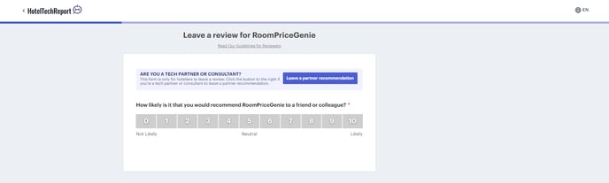 Eine Schritt-für-Schritt-Anleitung, wie Sie eine Bewertung über RoomPriceGenie auf HotelTechReport, einem Marktplatz für Hoteltechnologie, abgeben können.