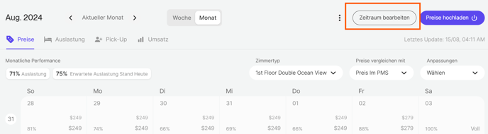 Mit der "Zeitraum bearbeiten"-Funktion haben Sie die Möglichkeit, Änderungen für einen bestimmten Zeitraum vorzunehmen. Wählen Sie einfach den gewünschten Zeitraum aus, und es erscheint ein Pop-up-Fenster, in dem Sie einen Aufschlag oder Rabatt auf alle Ihre Kategorien anwenden können. Diese praktische Funktion gibt Ihnen die Flexibilität, Ihre Preise über mehrere Tage hinweg an Ihre spezifischen Bedürfnisse anzupassen.