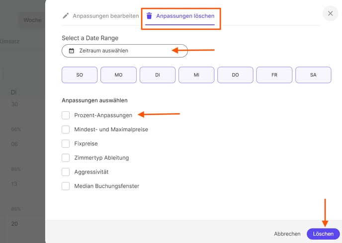 2) Über die Massenanpassung "Zeitraum bearbeiten" und "Anpassungen löschen", können Sie explizit nur die Prozent-Anpassung herausnehmen und mögliche weitere manuelle Anpassungen belassen.