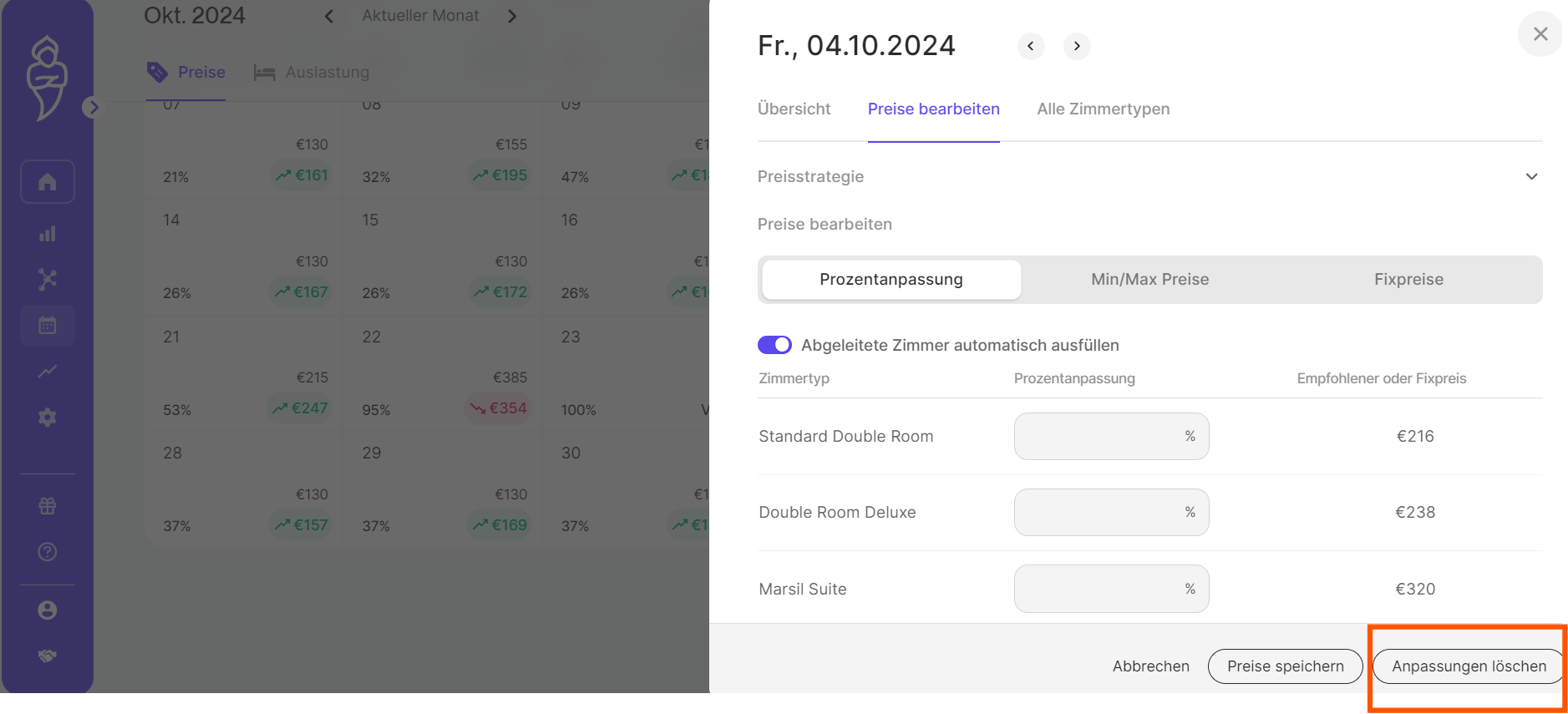 Wie löscht man "Prozent-Anpassungen" in RoomPriceGenie?