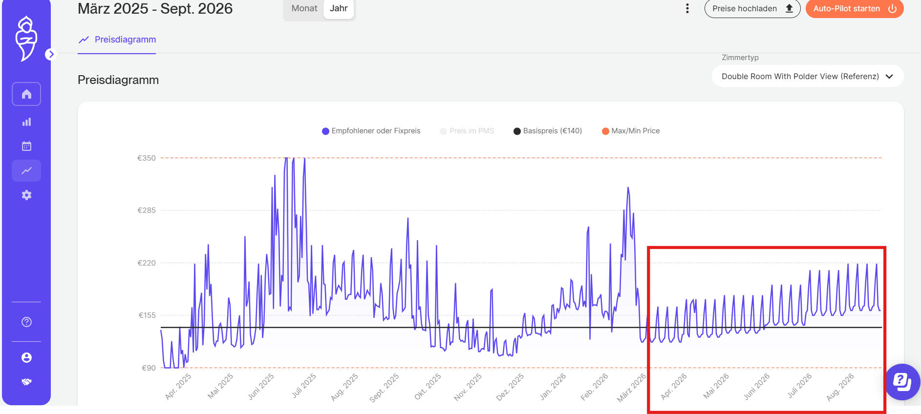 Genauer gesagt, legen wir für jeden Monat einen Durchschnittspreis fest. Dann verwendet der Algorithmus die aktuellen Wochentagsschwankungen, um die Preise für jeden einzelnen Wochentag im Monat festzulegen. Daneben fahren wir wie gewohnt mit unserer Optimierung für die aktuelle Verfügbarkeit fort.