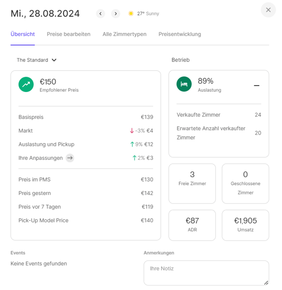Wenn Sie zum Beispiel nur noch 2 Zimmer zu verkaufen haben und dafür einen Monat Zeit haben, wissen wir, dass Sie mehr verlangen und trotzdem verkaufen können, da die Nachfrage hoch ist. Wenn Sie gleichzeitig 30 Zimmer für das kommende Wochenende übrig haben, müssen Sie die Preise senken, um sicherzustellen, dass Sie mehr Zimmer verkaufen.