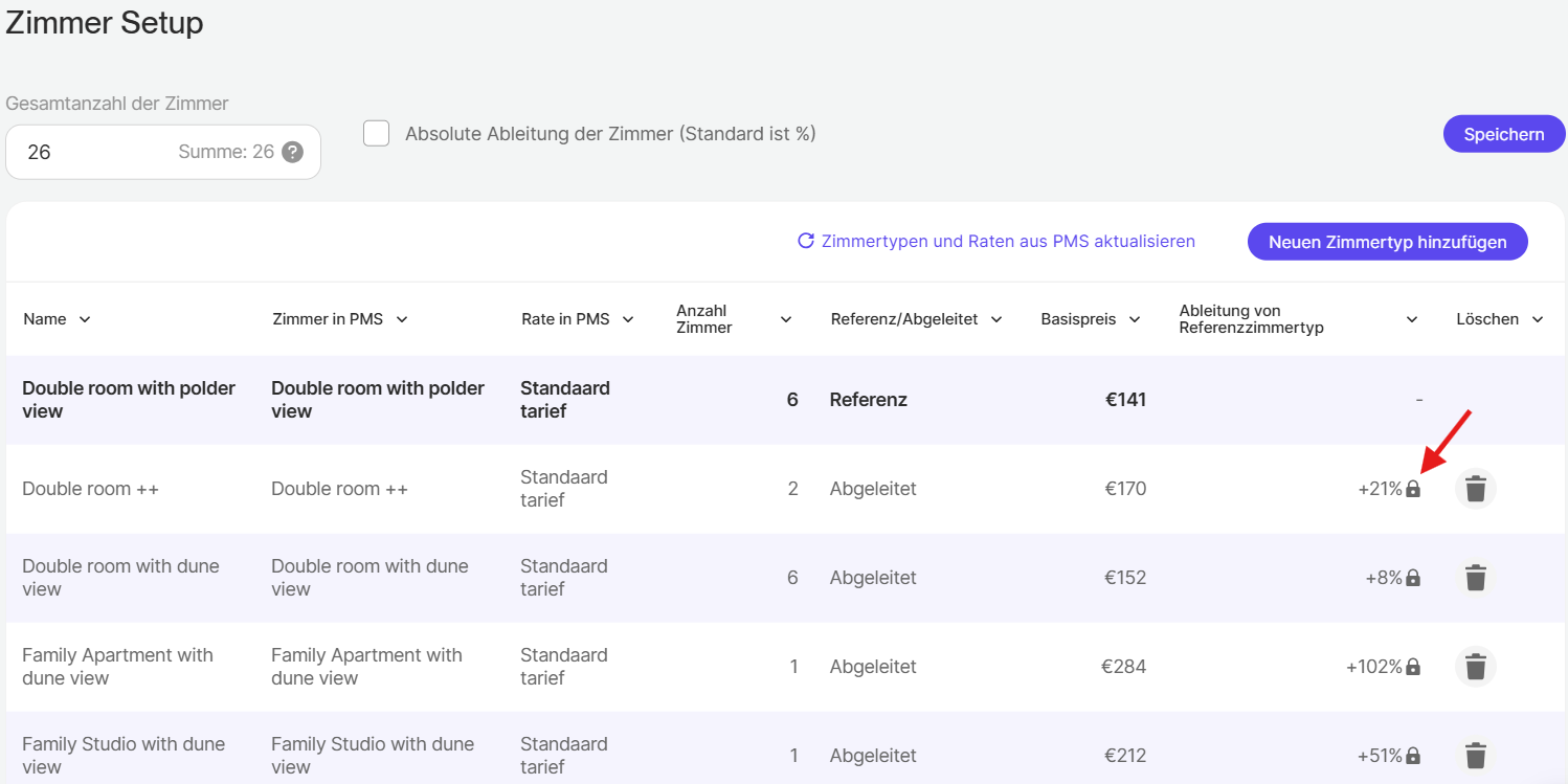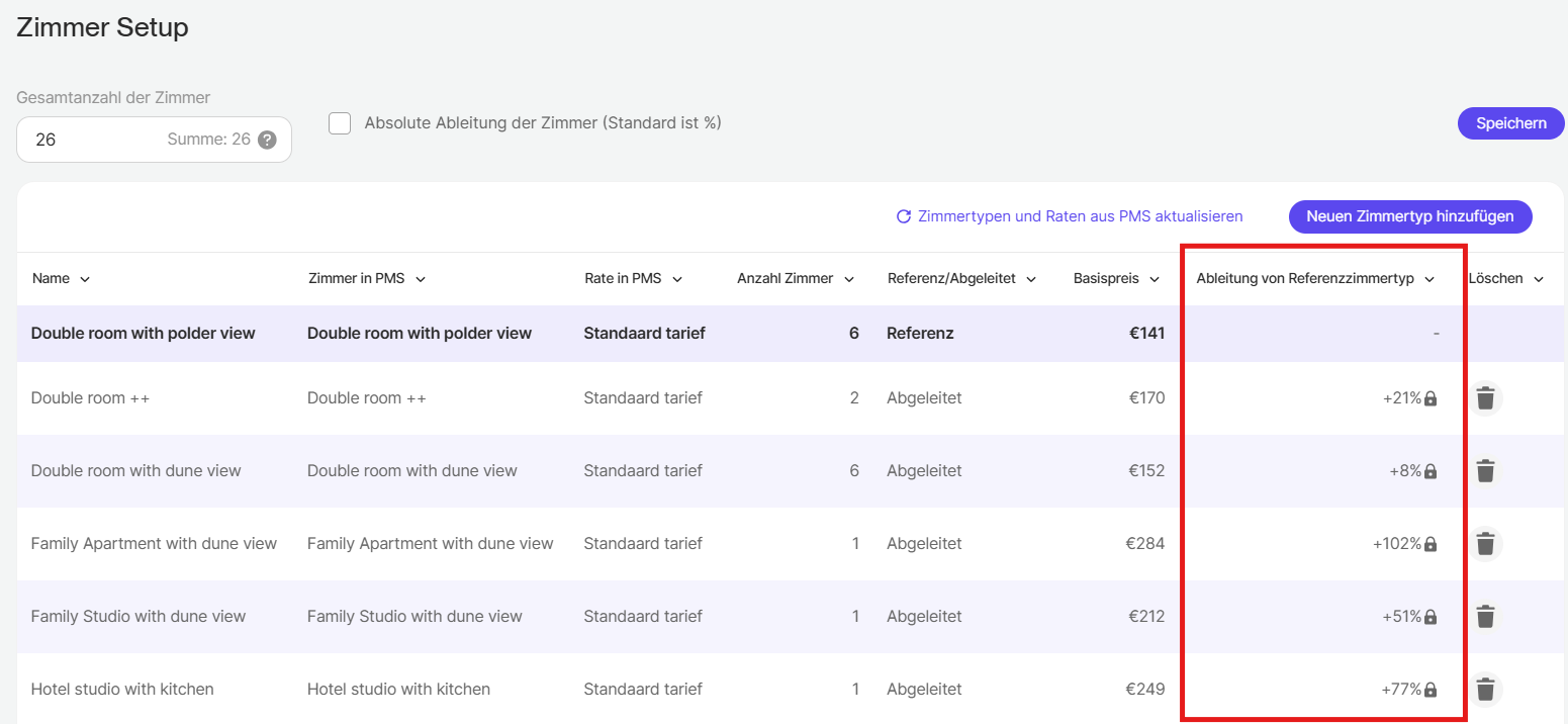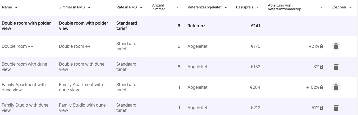 In RoomPriceGenie wählen wir immer einen Ihrer Zimmer als Referenzzimmeraus. Der Referenzzimmertyp in RoomPriceGenie ist der Zimmertyp, der als Basis für die Ableitung der übrigen Zimmerkategorien dient.