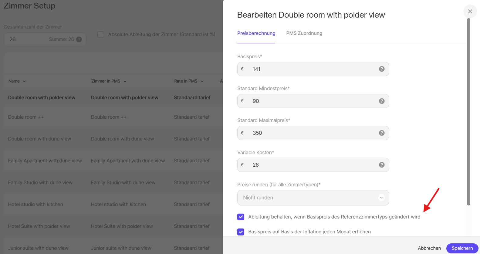 - Geben Sie die Ableitung vom Referenzzimmer entweder als Festpreis oder als Prozentsatz ein.