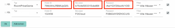 Geben Sie im RoomPriceGenie-Konfigurationsfenster die Zugangsdaten ein, die Sie vom RoomPriceGenie-Team erhalten haben: