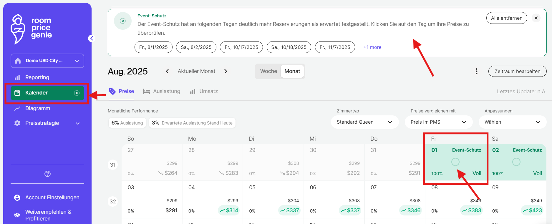 Wenn Ihr Haus innerhalb eines kurzen Zeitraums einen Ansturm von Reservierungen erfährt, sendet RoomPriceGenie Ihnen umgehend eine E-Mail und visualisiert Indikatoren für die stark nachgefragten Daten auf Ihrer Kontooberfläche. Dies gibt Ihnen Zeit und Flexibilität, die Situation zu überprüfen und die Preise entsprechend anzupassen.
