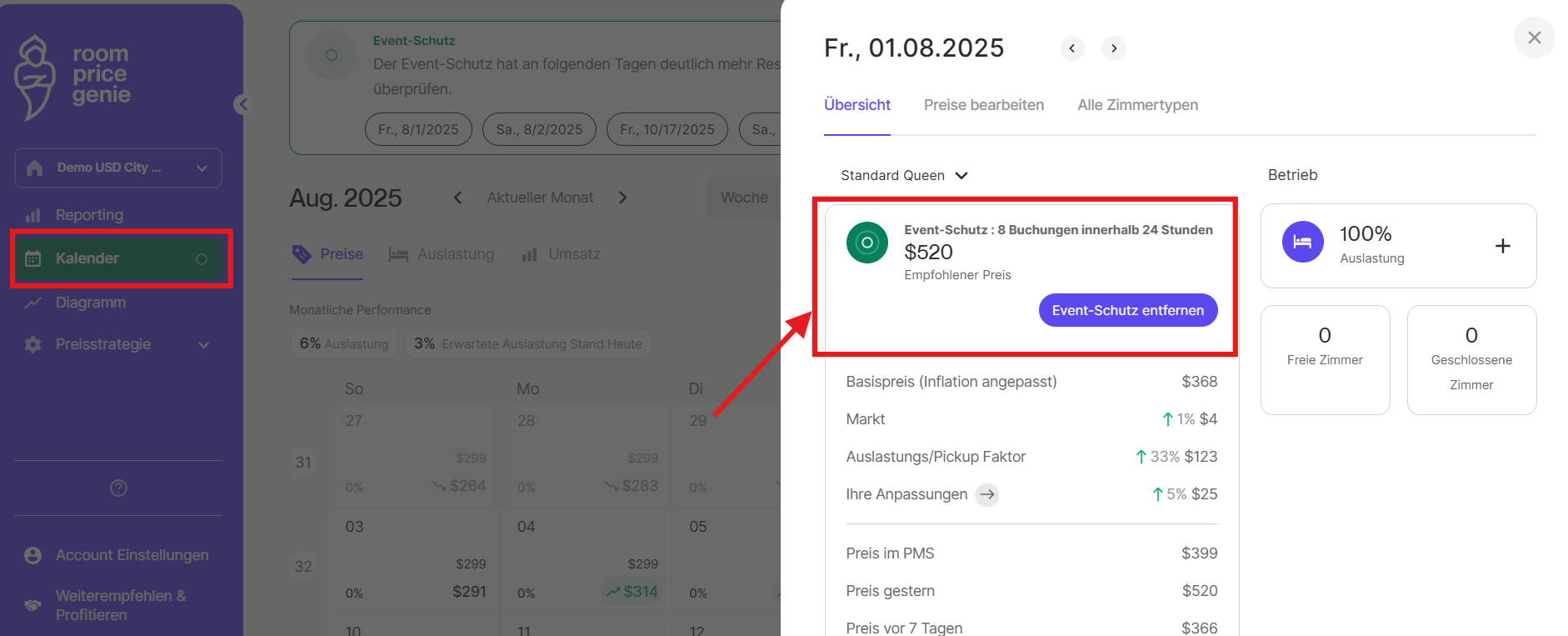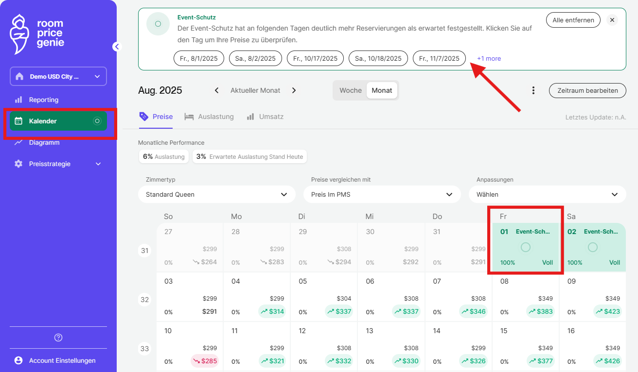 Bei den höheren Tarifen ProLite und Professional mildert der Überspannungsschutz proaktiv die Auswirkungen eines plötzlichen Anstiegs der Buchungsaktivität, d. h. er löst automatisch Preisanpassungen an Ihrer Preisstrategie für die betroffenen Daten aus. Wenn Sie die Funktion zur automatischen Preisgestaltung aktivieren, wenden wir vorübergehend Preise für den Überlastungsschutz an. Dieser strategische Eingriff ermöglicht es Ihnen, die Zimmerpreise als Reaktion auf eine erhöhte Nachfrage zu optimieren und sicherzustellen, dass Sie den vollen Wert Ihres Inventars ausschöpfen.
