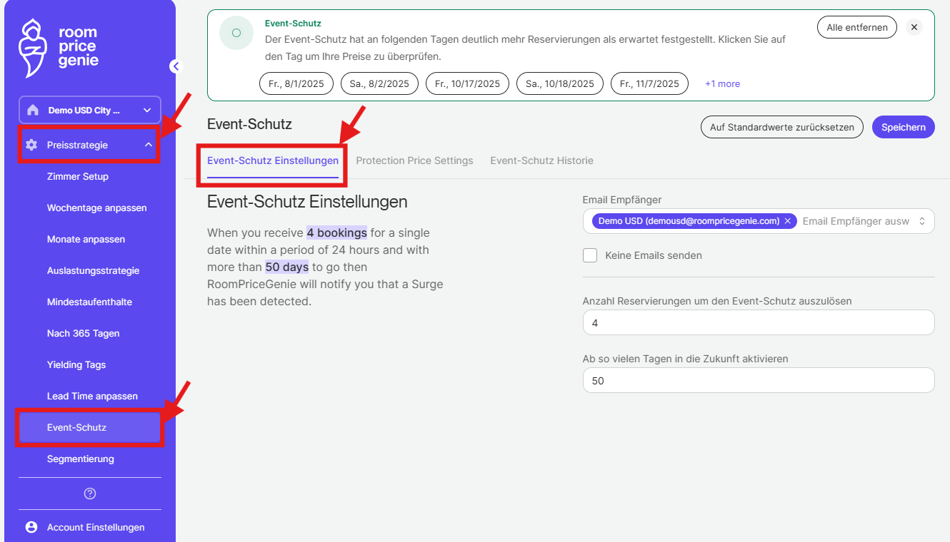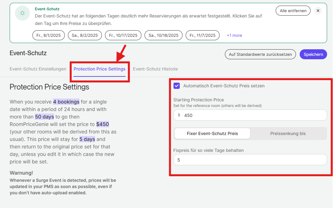 Während ein gewisses Maß an Überspannungsschutz in den höheren RoomPriceGenie-Tarifen verfügbar ist, kann die volle Funktionalität in den Pro-Lite- und Professional-Tarifen genutzt werden. Wenn Sie auf die Funktion nicht zugreifen können, zögern Sie bitte nicht, uns unter support@roompricegenie.com zu kontaktieren.