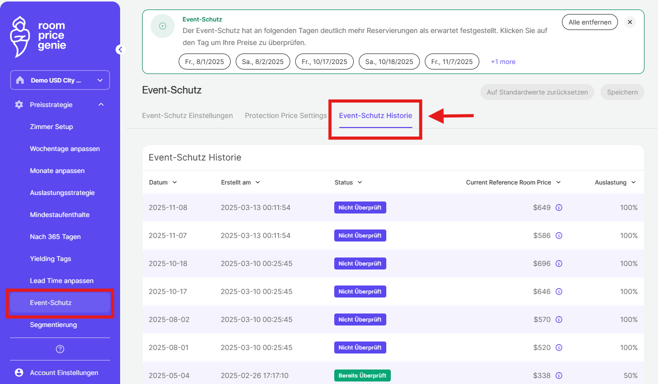 Wenn Sie z.B. innerhalb von 24 Stunden 10 Buchungen für ein einziges Datum mit mehr als 50 Tagen Vorlaufzeit erhalten, wird der Überspannungsschutz von RoomPriceGenie alarmiert.