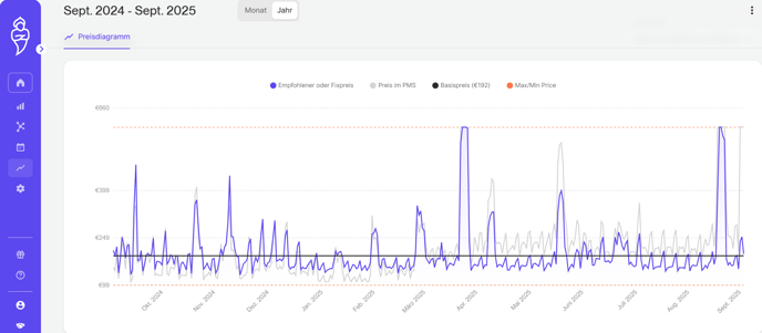 Der Grundpreis (blau) folgt dem lokalen Markt (rot). Diese Zahlen entsprechen dem in der Zimmereinrichtung definierten Basispreis plus dem Marktfaktor.