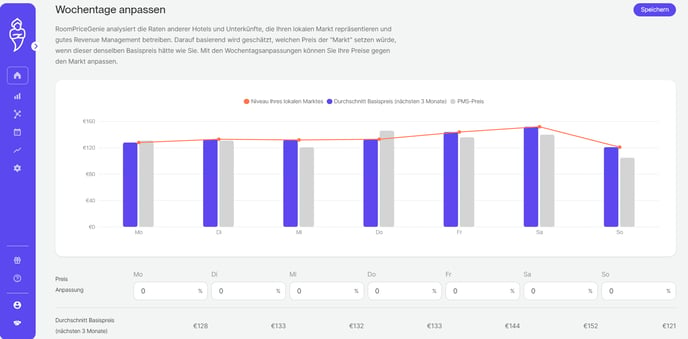 Wochentage anpassen - Beispiel: Möglicherweise ist sonntags mehr los, weil Sie ein tolles Restaurant haben, das mehr Gäste anzieht als andere Hotels an Sonntagen. In diesem Fall können Sie an diesem Tag höhere Preise verlangen, da Sie wissen, dass die Nachfrage nach Ihrem Hotel an diesem Tag grösser ist. Die Verwendung von "Wochentagsanpassungen" soll uns dabei helfen, dies zu erreichen.