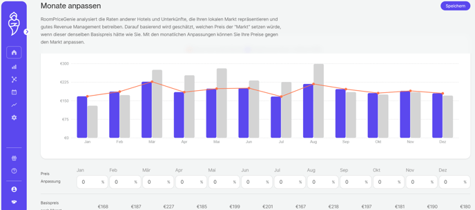 Die Monats-Anpassungen können Ihnen dabei helfen, die Monate des Jahres zu identifizieren und anzupassen, in denen Sie teurer oder billiger sein müssen als die Hotels, die von Ihrer Marktintelligenz dargestellt werden. Sie werden auch zur Darstellung der Saisonalität verwendet.