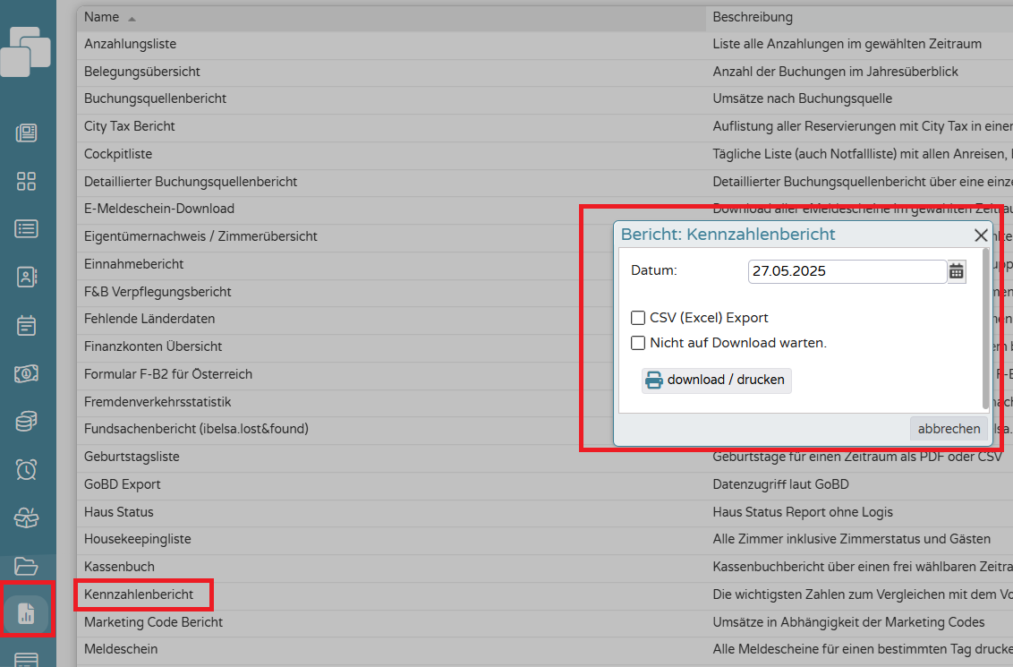 Nach dem Einloggen in das Ibelsa-Konto klicken Sie im Menü auf der linken Seite auf das Berichte-Symbol und wählen Sie anschließend Kennzahlenbericht aus der Liste aus, wie im untenstehenden Screenshot dargestellt.