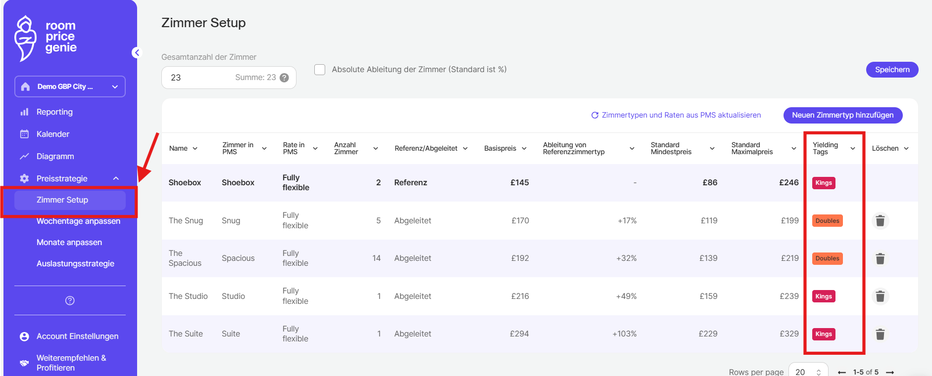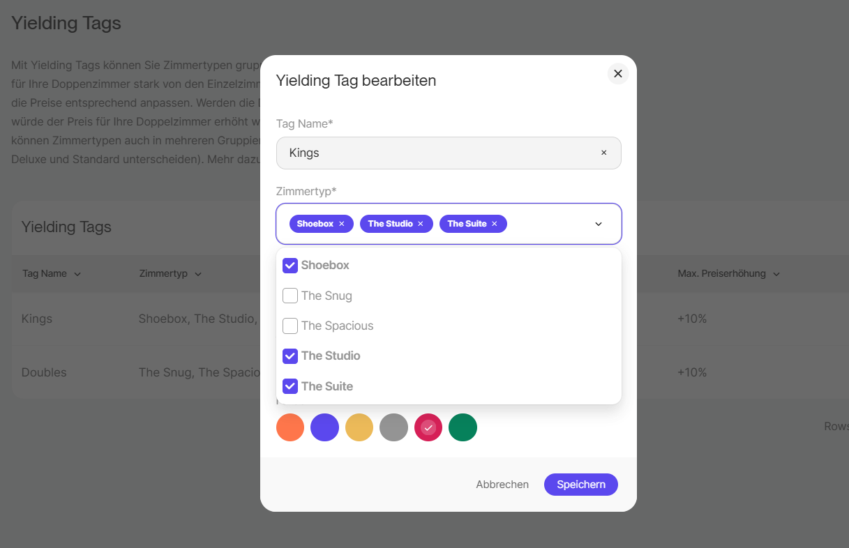 Verwaltung von Yielding Tags für einzelne Zimmertypen