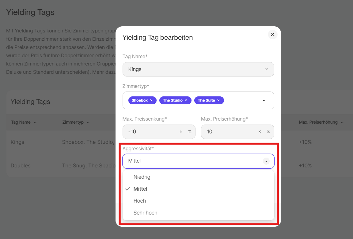 Die Aggressivität bestimmt, wie schnell sich die Anpassungen in Richtung der Höchst- oder Mindestgrenzen bewegen. Die Auswahl einer hohen Aggressivität bedeutet, dass sich die Preise schnell an die Höchst- oder Mindestgrenze anpassen, wenn es ein erhebliches Buchungsungleichgewicht zwischen den Zimmertypen gibt. Im Gegensatz dazu führt eine niedrige Aggressivität zu schrittweisen Preisanpassungen, die auf denselben Faktoren basieren.