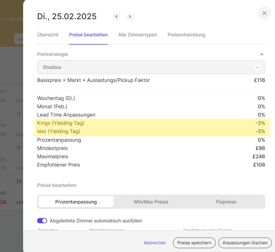 - Angenommen, die Standardpreisempfehlung für Raum A beträgt 100 €, und Raum B hat eine Ableitung von +25 %, so dass sein empfohlener Preis 125 € beträgt.