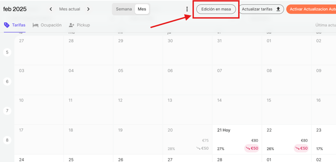 Utilice la función Edición en masa para seleccionar un período de tiempo definido. En la ventana emergente que aparece, podrá aplicar un recargo o descuento a todas sus categorías de habitación durante varios días.