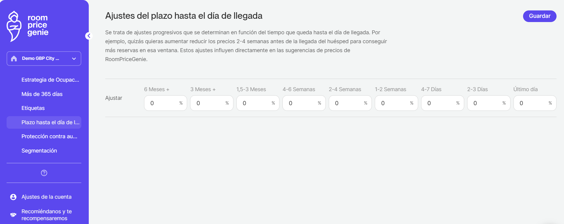 Página de 'Ajustes del plazo hasta el día de llegada' en la aplicación RoomPriceGenie