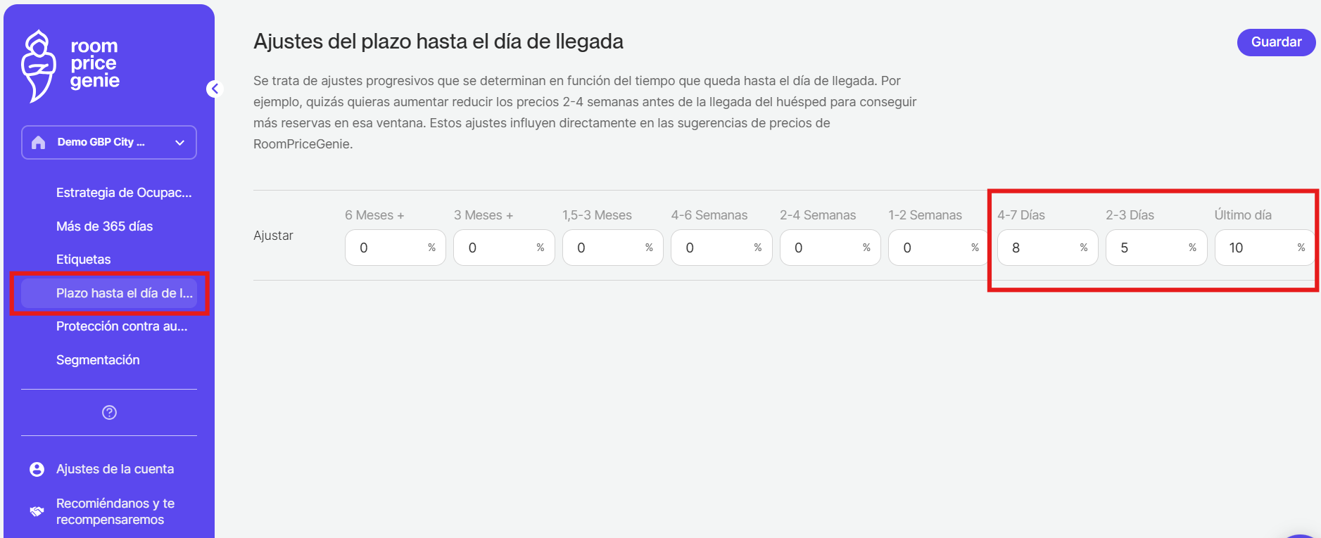 Por ejemplo: si pone -10 en la casilla de 4-7 días, entonces los precios se reducirían un 10% por cada noche que esté entre 4 y 7 días en el futuro.