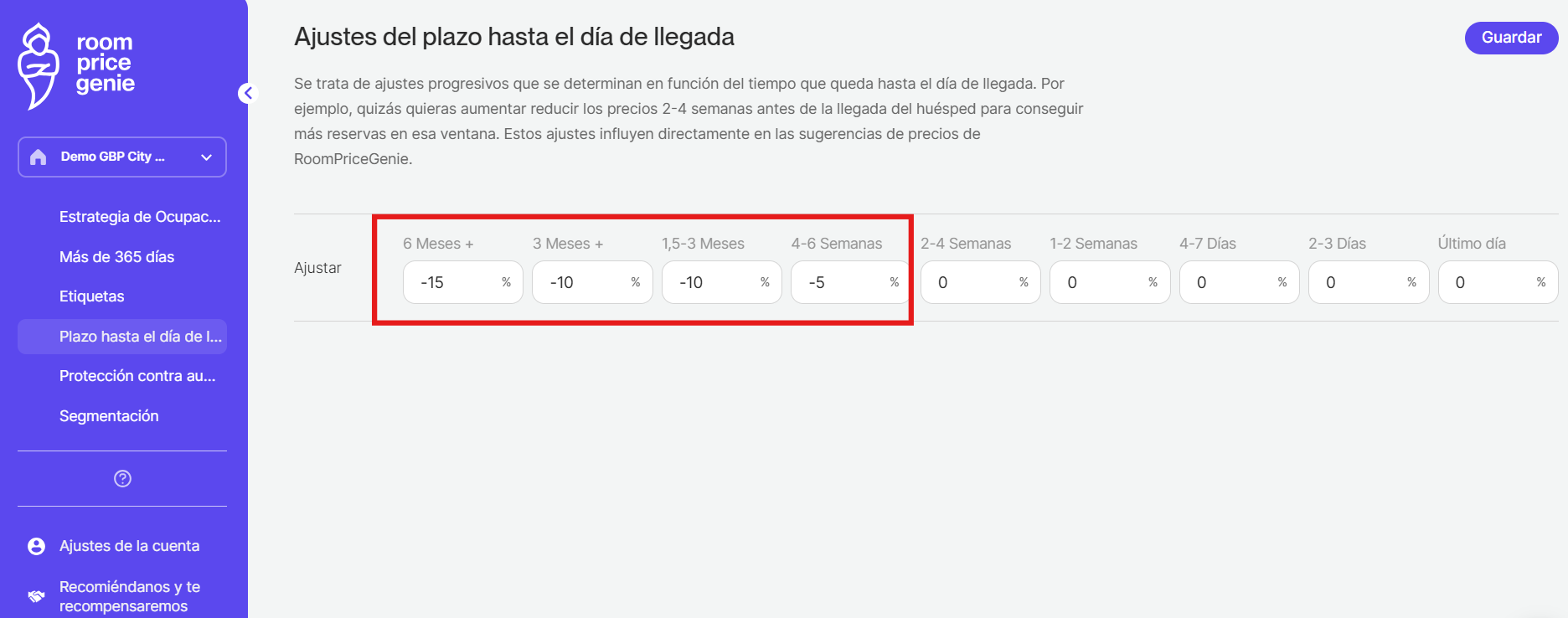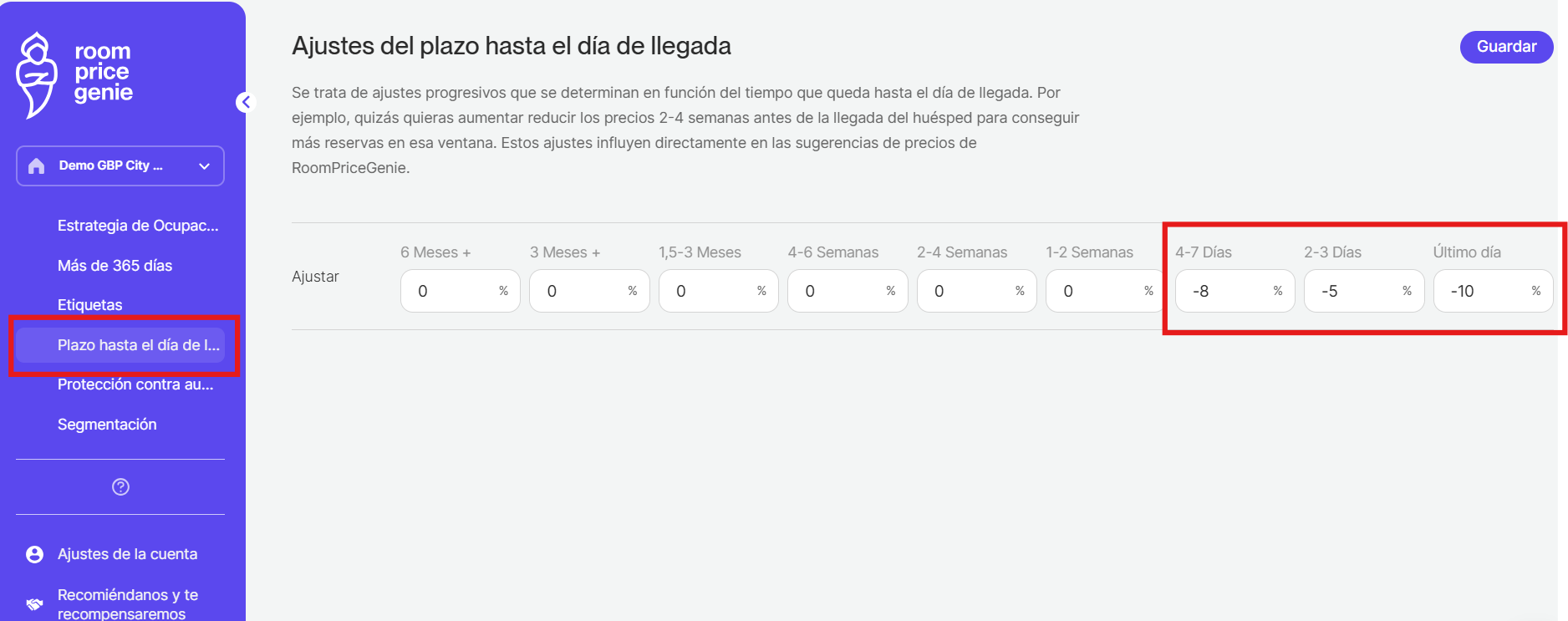 Si cree que RoomPriceGenie no ha bajado los precios lo suficiente en los últimos días, y si le gusta ir a la baja independientemente de su ocupación, entonces puede considerar añadir un ajuste de valores negativos.