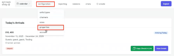 - Ir a la sección Configuración > Propiedades. Seleccionar la propiedad en cuestión.