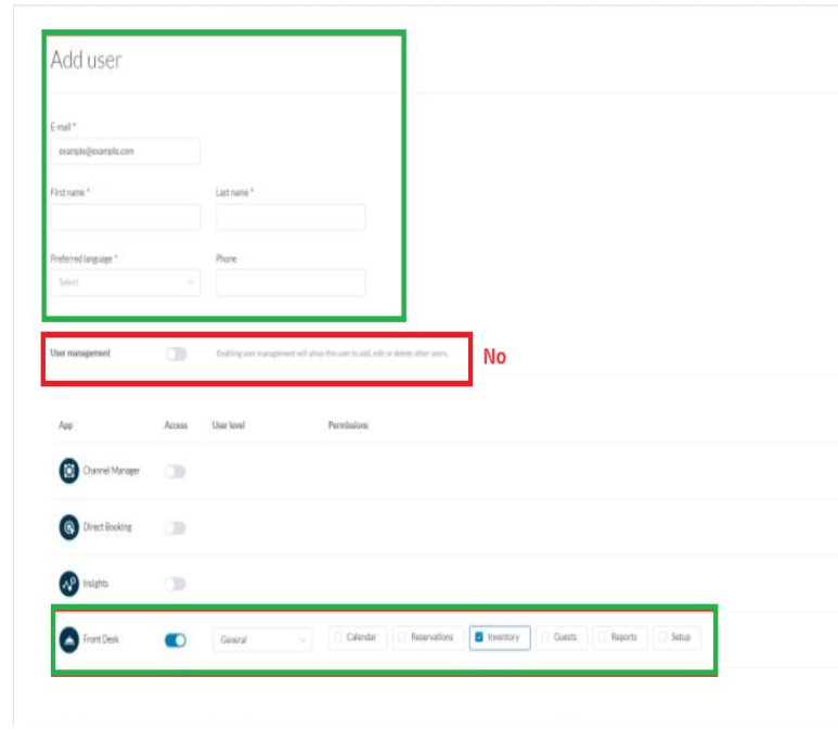En cuanto a los permisos de acceso, activa únicamente “Front Desk” y selecciona “General” como nivel de usuario.