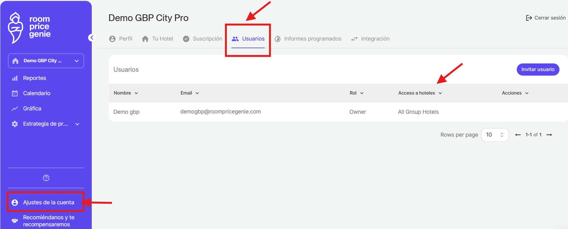En caso de que no sea la única persona que trabaja con nuestros sitema, puede crear usuarios adicionales en la aplicación RoomPriceGenie. Si tiene varias propiedades, también debe seleccionar la propiedad a la que desea que tenga acceso el nuevo usuario. Vaya a Ajustes de la cuenta > Usuarios.