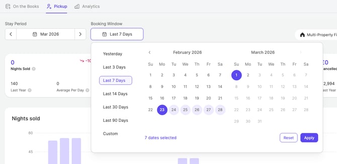 El panel de Pickup muestra cuántas noches se han reservado dentro de una ventana de reserva seleccionada, cuántas se han cancelado y cómo se compara esta información con el año anterior (LY). Esto te ayuda a evaluar si tu ritmo de reservas es saludable y si está alineado con tus expectativas.