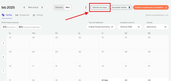 Con la función de Edición en masa, puede seleccionar días específicos de la semana durante un período de tiempo determinado y ajustar los precios mínimos y/o máximos.