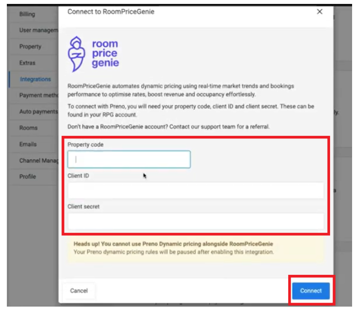 Este artículo explica los pasos necesarios para conectar tu cuenta de Preno con el RMS de RoomPriceGenie.