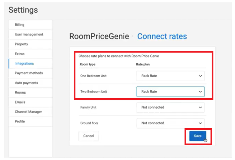 Paso 4: Conecta las tarifas a cada tipo de habitación y haz clic en Guardar (Save).
