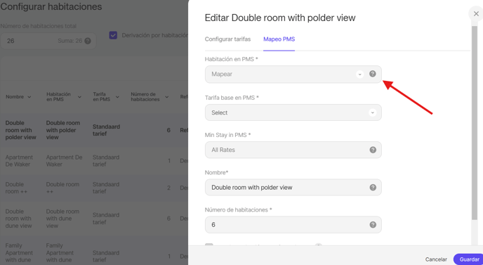 - Si ya está en la lista, haga clic en el tipo de habitación que desea configurar; se abrirá una nueva ventana; vaya a Mapeo PMS/CM, donde en Habitación en PMS tendrá que desasignar la habitación seleccionando "Por favor mapear".
