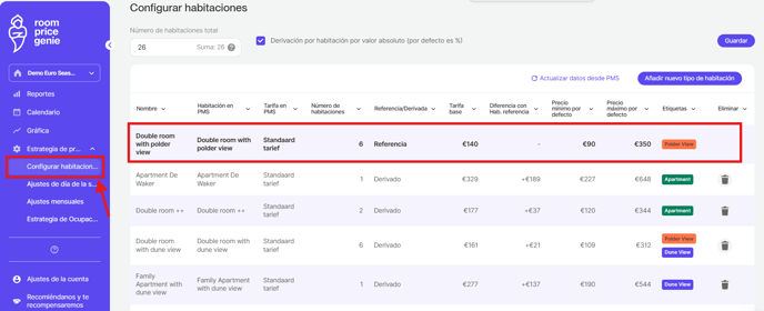 El tipo de habitación de referencia será el primer tipo de habitación que verá al iniciar sesión en la cuenta de RoomPriceGenie, y esta habitación será la base para nuestra optimización de ingresos.