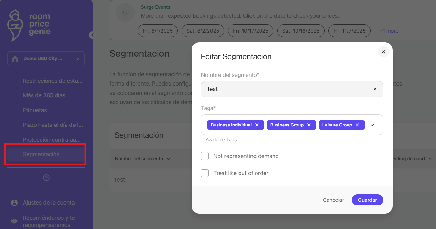 El uso de la función de segmentación de RoomPriceGenie le permite: